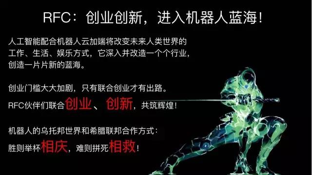 隨著創(chuàng)業(yè)門檻大大加劇,只有聯(lián)合創(chuàng)業(yè)才有出路,RFC伙伴們聯(lián)合創(chuàng)業(yè),創(chuàng)新,一起共筑輝煌!我們崇尚機器人的烏托邦世界和希臘聯(lián)邦合作方式:勝則舉杯相慶,難則拼死相救!